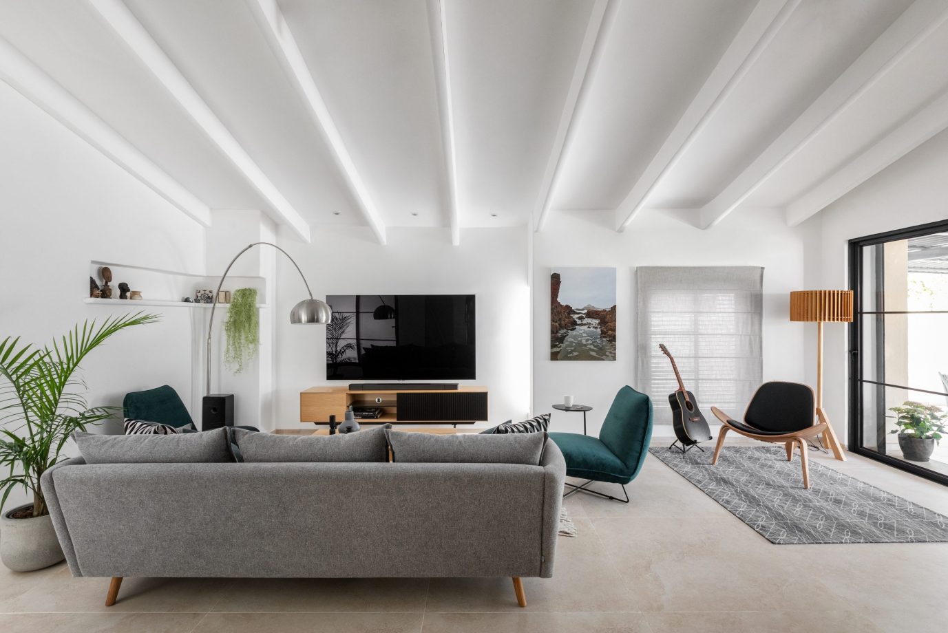 גם הסלון זכה להתייחסות מיוחדת. סלון מבולגן הוא פריבילגיה בלתי אפשרית בדירה קטנה, משום שהוא מקטין משמעותית את תחושת המרחב. לכן בעיצוב החלל המרכזי של יחידת הדיור שולבו רהיטים קומפקטיים ופונקציונליים ברוח ההשראה הנורדית (הכל מבית SIMPLY-WOOD), החל מספה מינימליסטית ונוחה שנפתחת למיטה כאשר מגיעים אורחים.