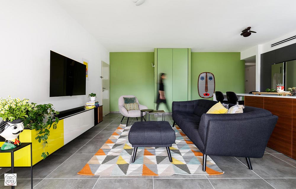 הפרויקט של מעצב הפנים עמית פפו ממחיש בצורה מושלמת את עיקרון יחסי הצבעים המומלצים. למשטחים הגדולים (ריצוף, קירות) נבחרו אפור ולבן, הצבע הכחול משמש כאן כצבע ה"נועז" והמגוון, אליו התווספו גוונים של ירוק ש'מקפיצים' את החלל. גם באביזרים המעטרים את האזורים נשמר הקשר – צבעי הכריות משתלבים עם צבע התמונה בפינת האוכל השימוש בצמחייה מזריק חיוּת וחמימות לעיצוב הנקי.